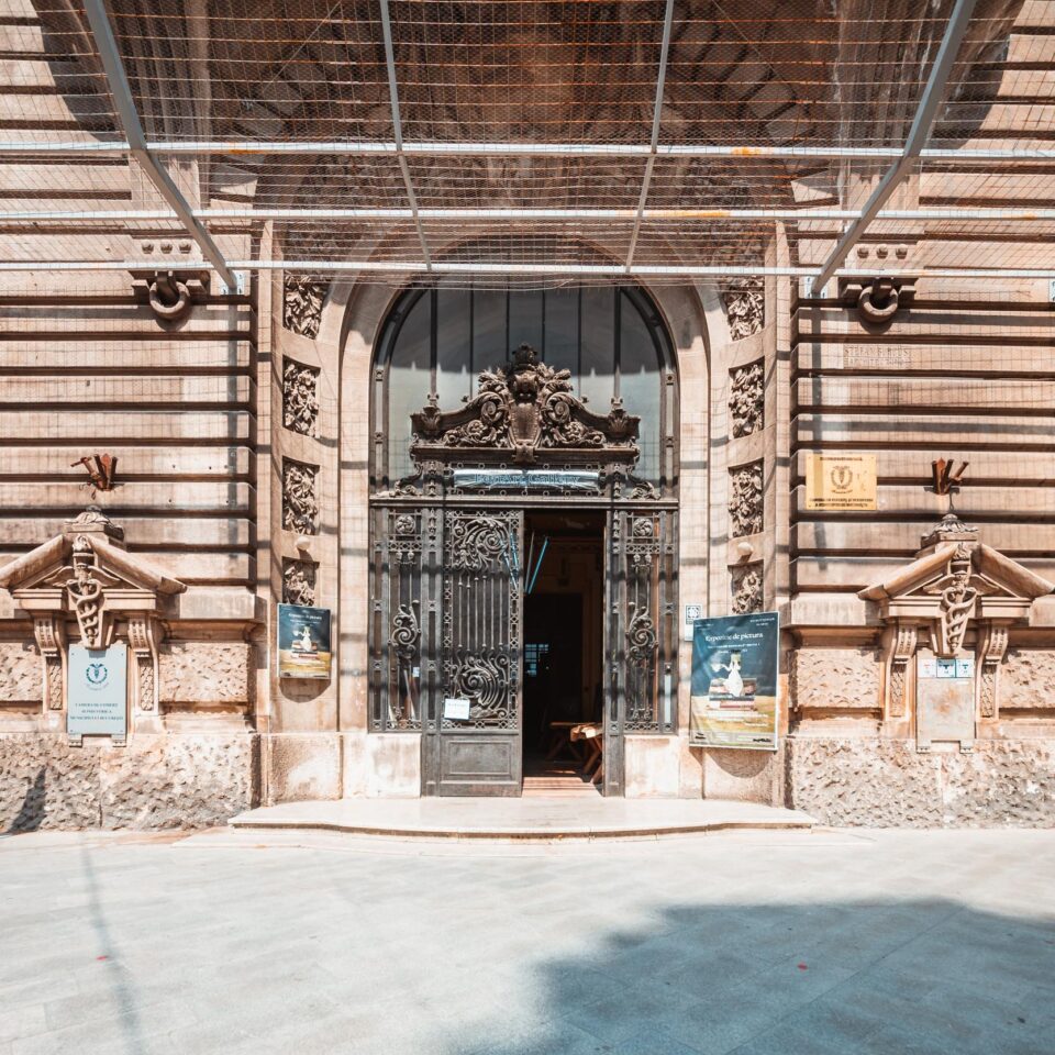 Se remarca frontonul semicircular care are la centru, sus, un ecuson cu un cap de leu (basorelief), încadrat de doua personaje alegorice adosate, în stânga Industria (o femeie îmbracata în voaluri, ce-si sprijina mâna stânga pe coada unui ciocan), iar în dreapta Comertul (zeul Mercur, ce tine în mâna stânga caduceul, iar în dreapta o ancora). Personajele, realizate în piatra, ronde-bosse, la dimensiuni naturale, exprima noblete si gravitate.